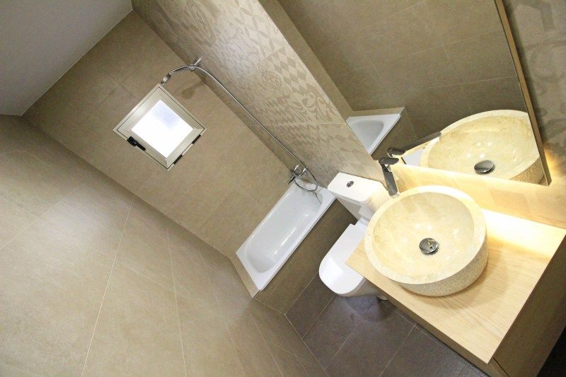 En el baño pequeño se ha optado por una línea de estampados en la pared que continúan la línea de color con el suelo y el lavamanos. Aquí nos encontraremos con una bañera de pequeñas dimensiones, para que el espacio quede con las dimensiones propias de un aseo, pero que tenga opción de baño.